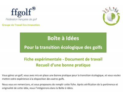 La FFGolf met à disposition de tous les golfs un TABLEAU qui présente de façon simple des bonnes pratiques expérimentées par des golfs. Beaucoup de golfs adhérents du GEGF y présentent des idées ingénieuses pour avancer dans la transition écologique.